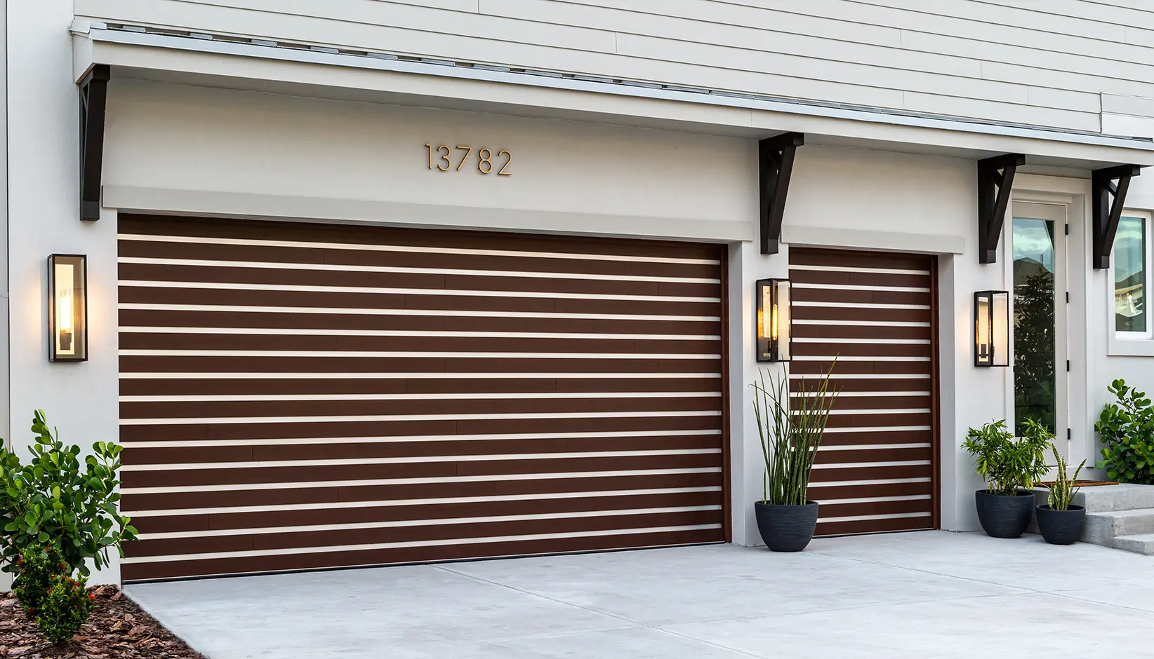 Statement-making and sophisticated, our Canyon Ridge Modern faux wood garage doors combine realistic wood textures with key elements of contemporary architecture: clean, horizontal lines with mid-century appeal, slim windows and metallic accents.